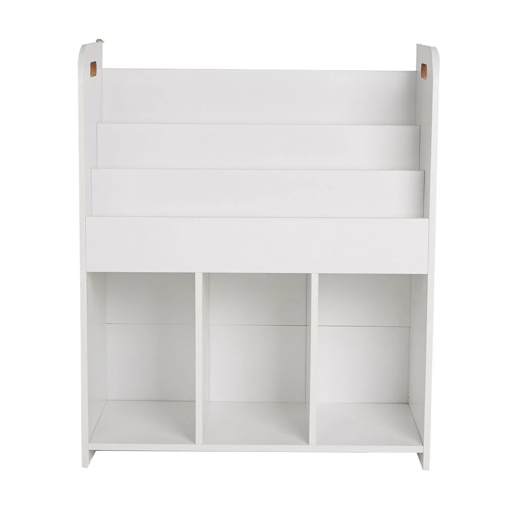 - This kids’ storage shelving unit features a slotted tier at the top for storing children’s books, coloring books, and notebooks, and a lower tier with three compartments for storing small storage bins, boxes, and toys