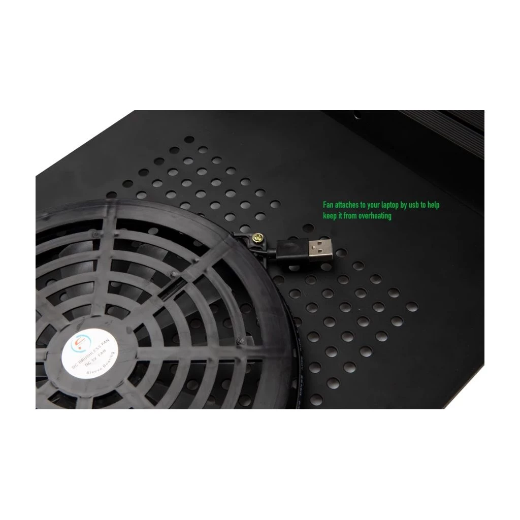 - Ventilated steel panel allows air to easily circulate underneath laptops or tablets, allowing extended use without overheating; connect the fan to your laptop via the built-in USB cord for additional cooling